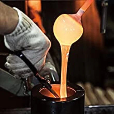 高熱で溶けたガラスを竿に巻き取り、金型へ溶けたガラスを落とし込む。