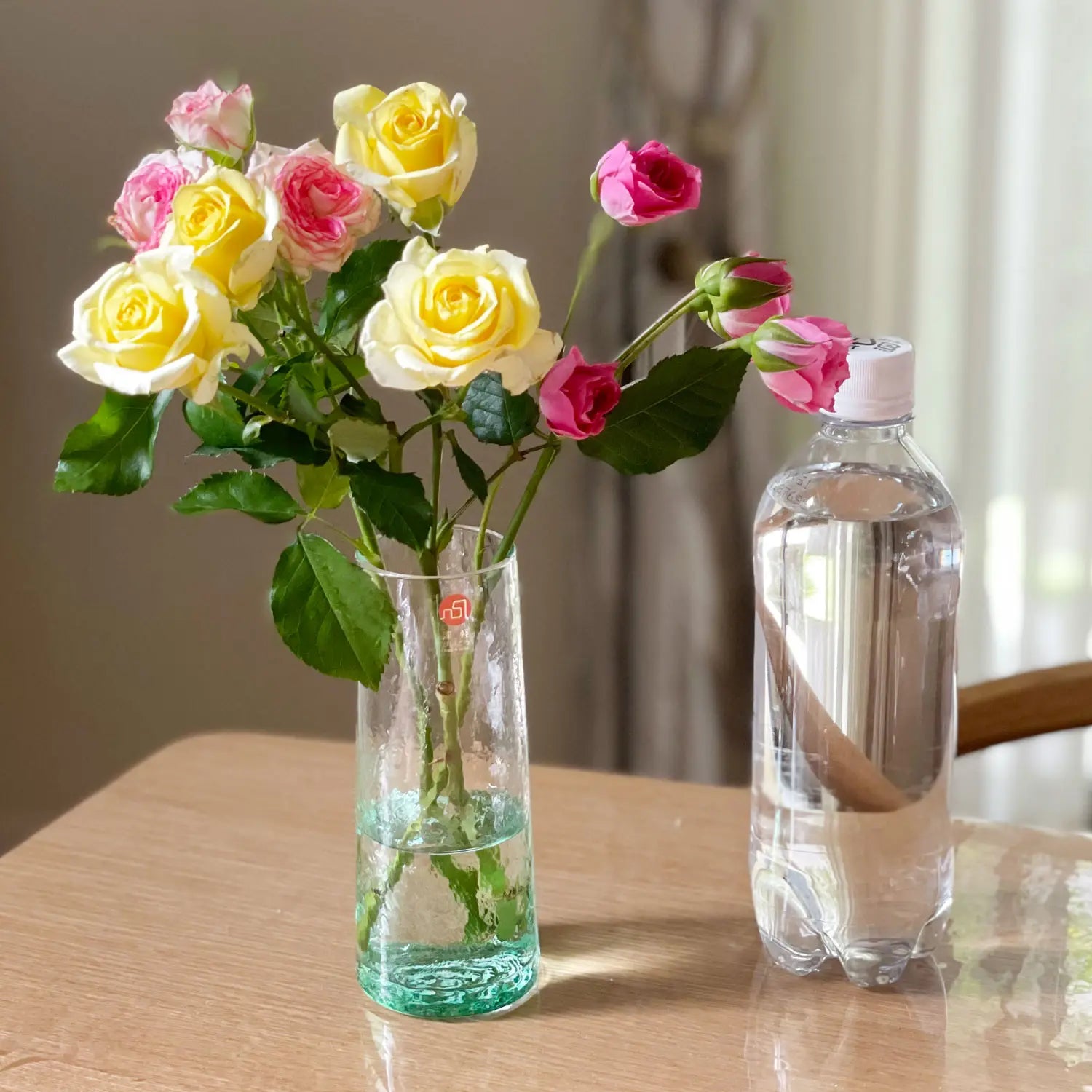 ガラスの透明感と柔らかで優しい色合いのミニ花瓶が生けたお花を引き立てます。