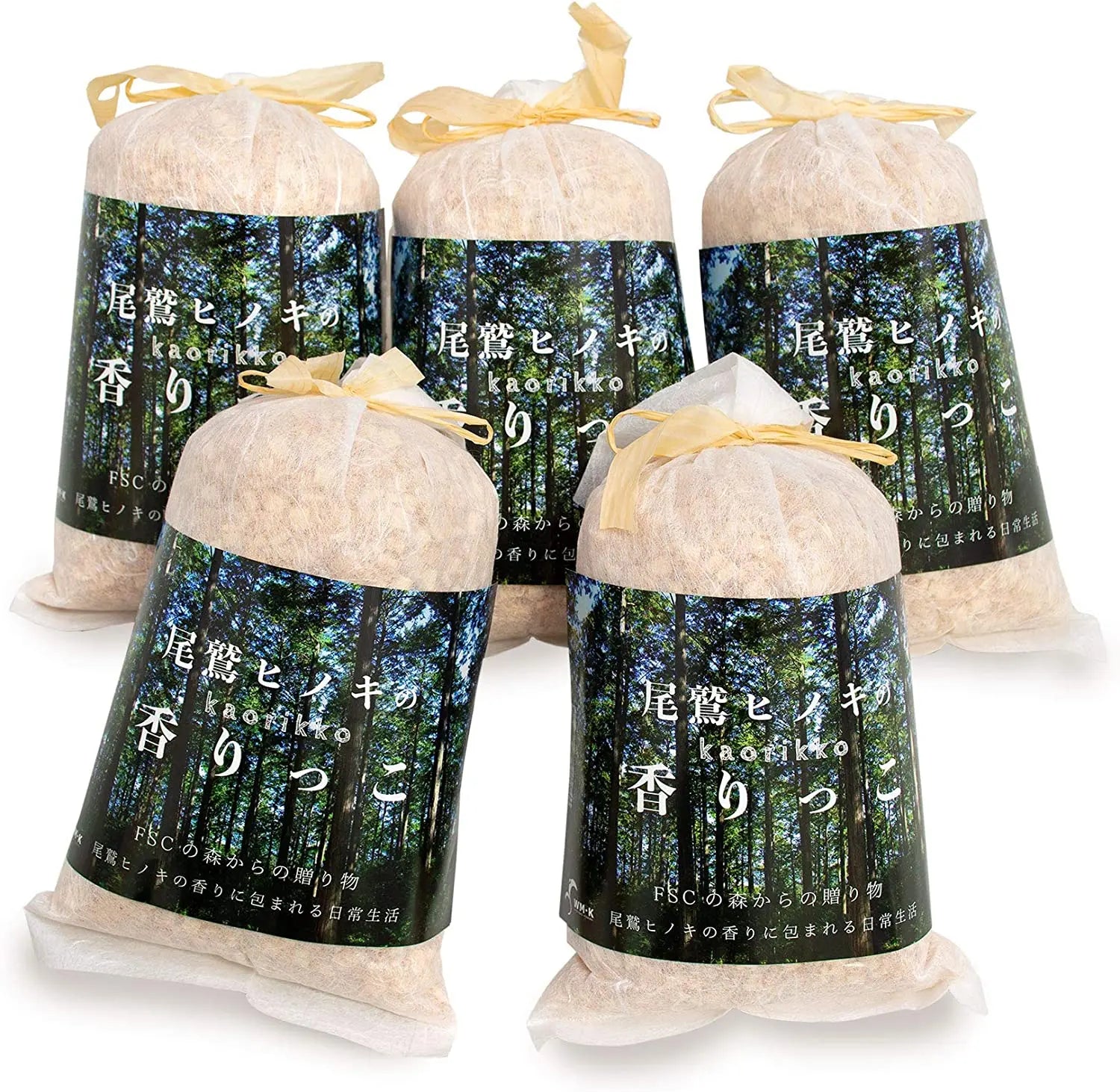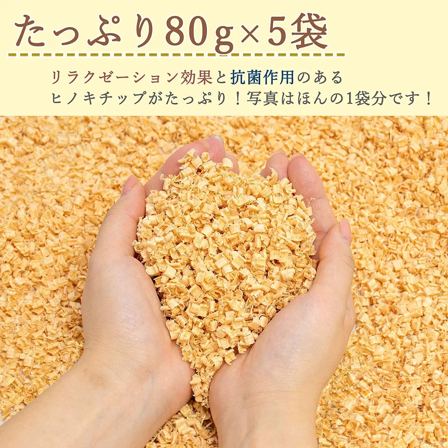 ヒノキチップたっぷり80gの袋を5袋セットでお届けします。