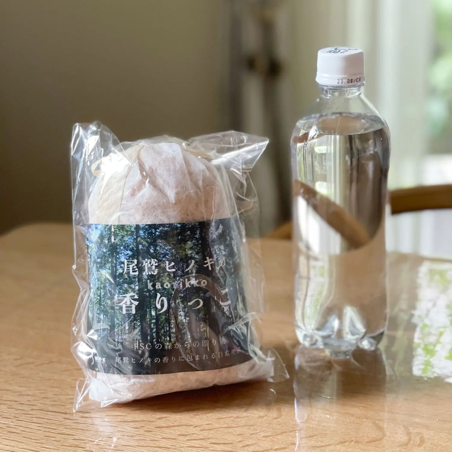 1袋80gで檜チップをたっぷり使えます。500mlのペットボトルとのサイズを比べてください。