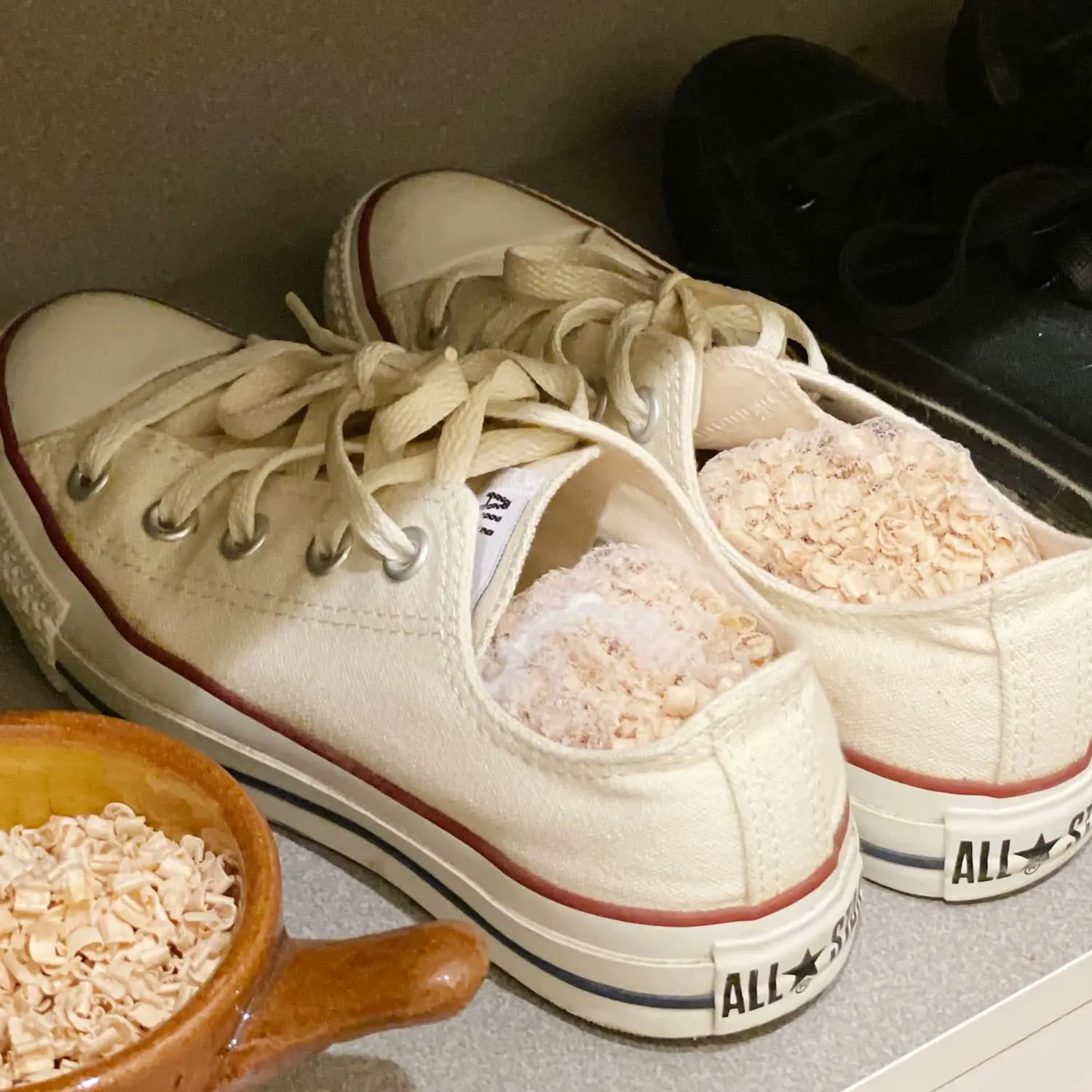 においが気になる靴には中に入れておけば消臭。ヒノキチップには、調湿効果もあるのでサラッとさわやかな状態になります。
