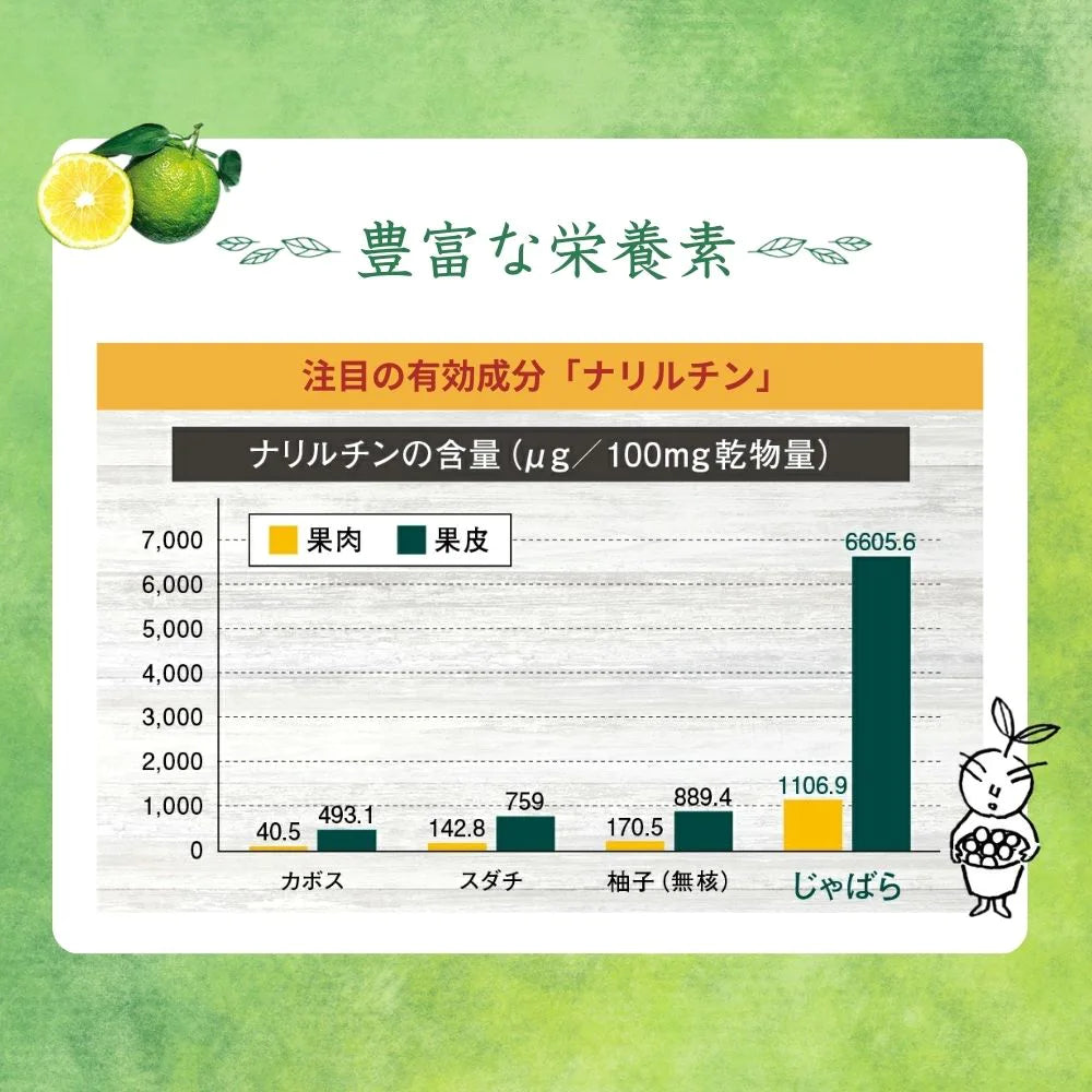 希少な柑橘『じゃばら』の果皮には、注目の有効成分「ナリルチン」が豊富に含まれています。