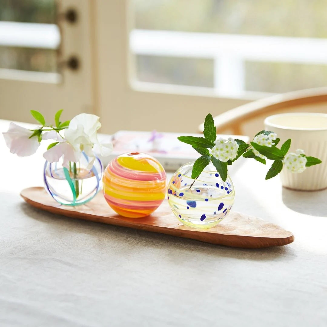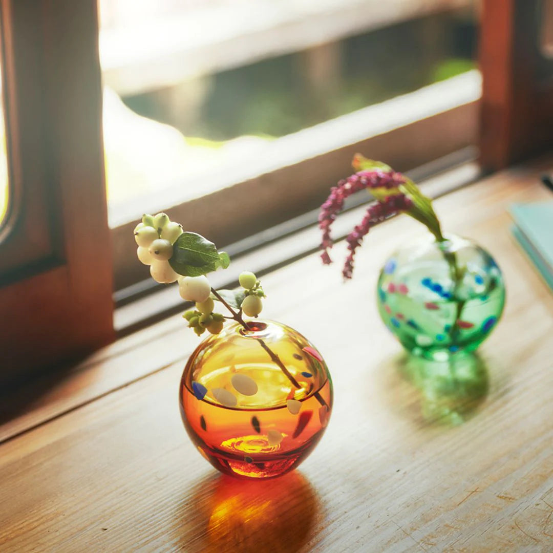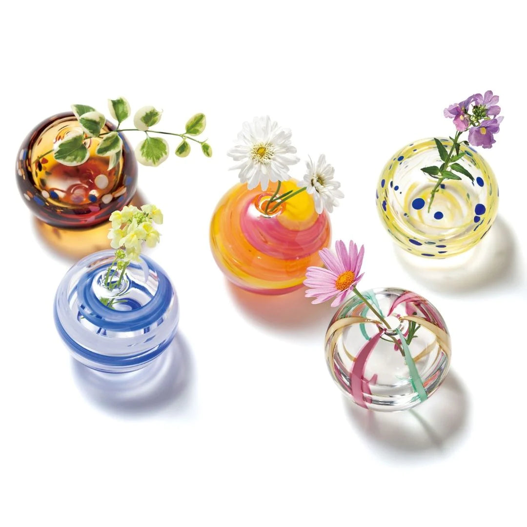 『彩手鞠』は季節の色や模様をイメージしてつくられた、ガラスの一輪挿しです。